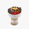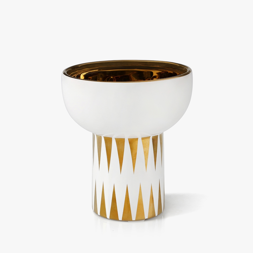 Élégante coupe sur pied, caractérisée par une base ornée de pointes dorées graphiques et un réceptacle blanc immaculé. Une présentation raffinée pour sublimer les chocolats.