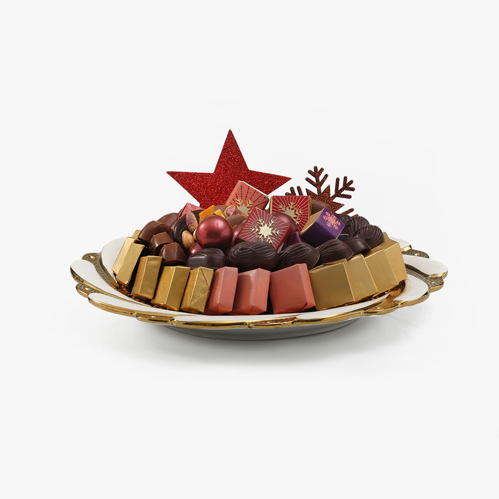 Assiette ronde soulignée d’un délicat contour blanc et doré contenant un assortiment de 800g de chocolats