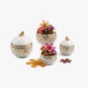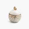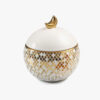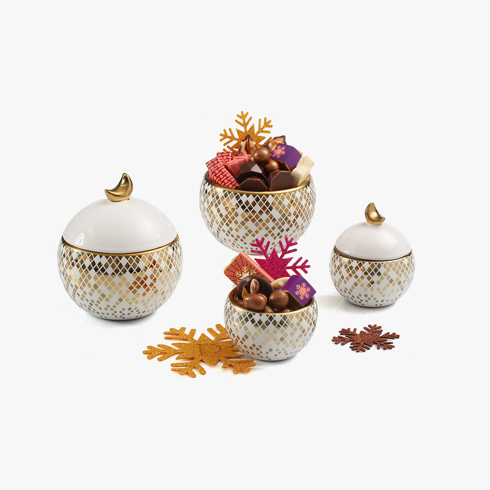 Bonbonnière au motif losange blanc et doré contenant un assortiment de chocolats